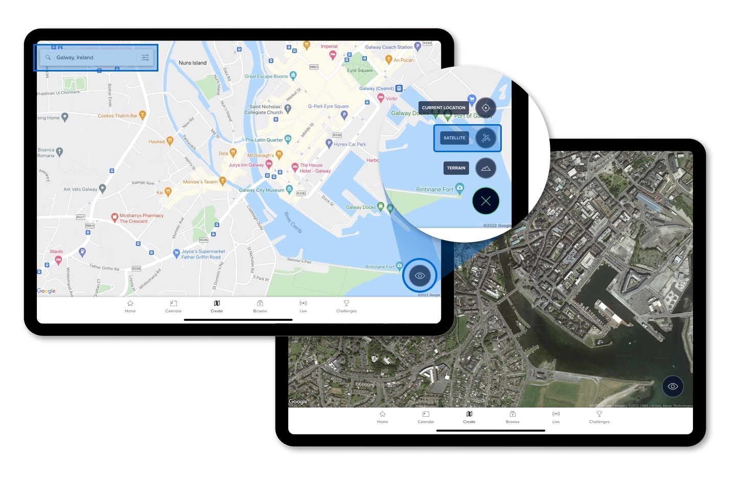 - Press the eye icon in the bottom right corner of your screen to toggle between the basic map view and the Google Maps™ satellite view.