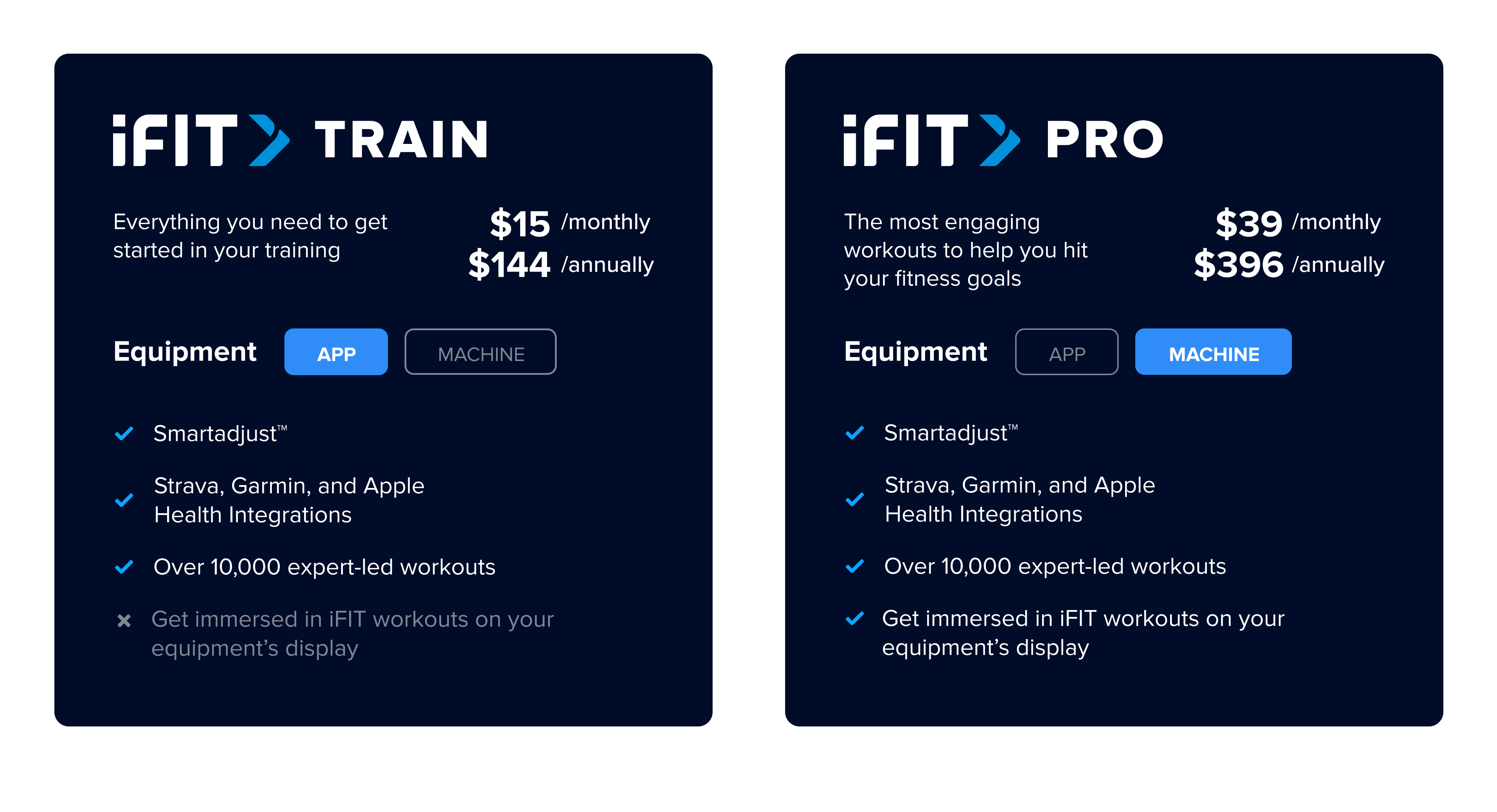 Both Train and Pro membership plans include all current iFIT features, with additional new features planned for release in the near future.