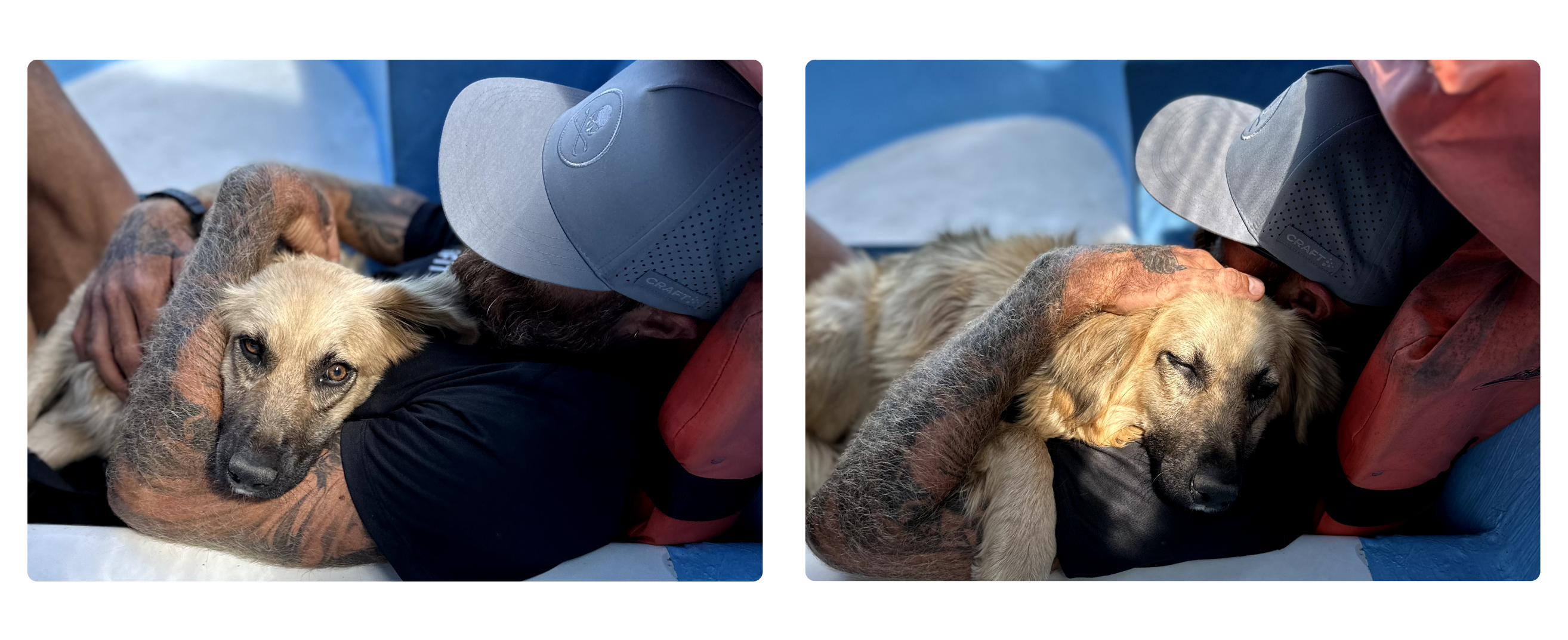 Terrified, Ick refused to get on the boat but wanted to stay with us. Juan picked her up and carried her onto the boat. Laying at the front of the boat, Ick continued shaking once the boat started. Tommy then got up from his seat and sat down on the floor next to Ick. He pulled her on top of him and held her for the duration of the 30-minute bumpy boat ride across the lake.